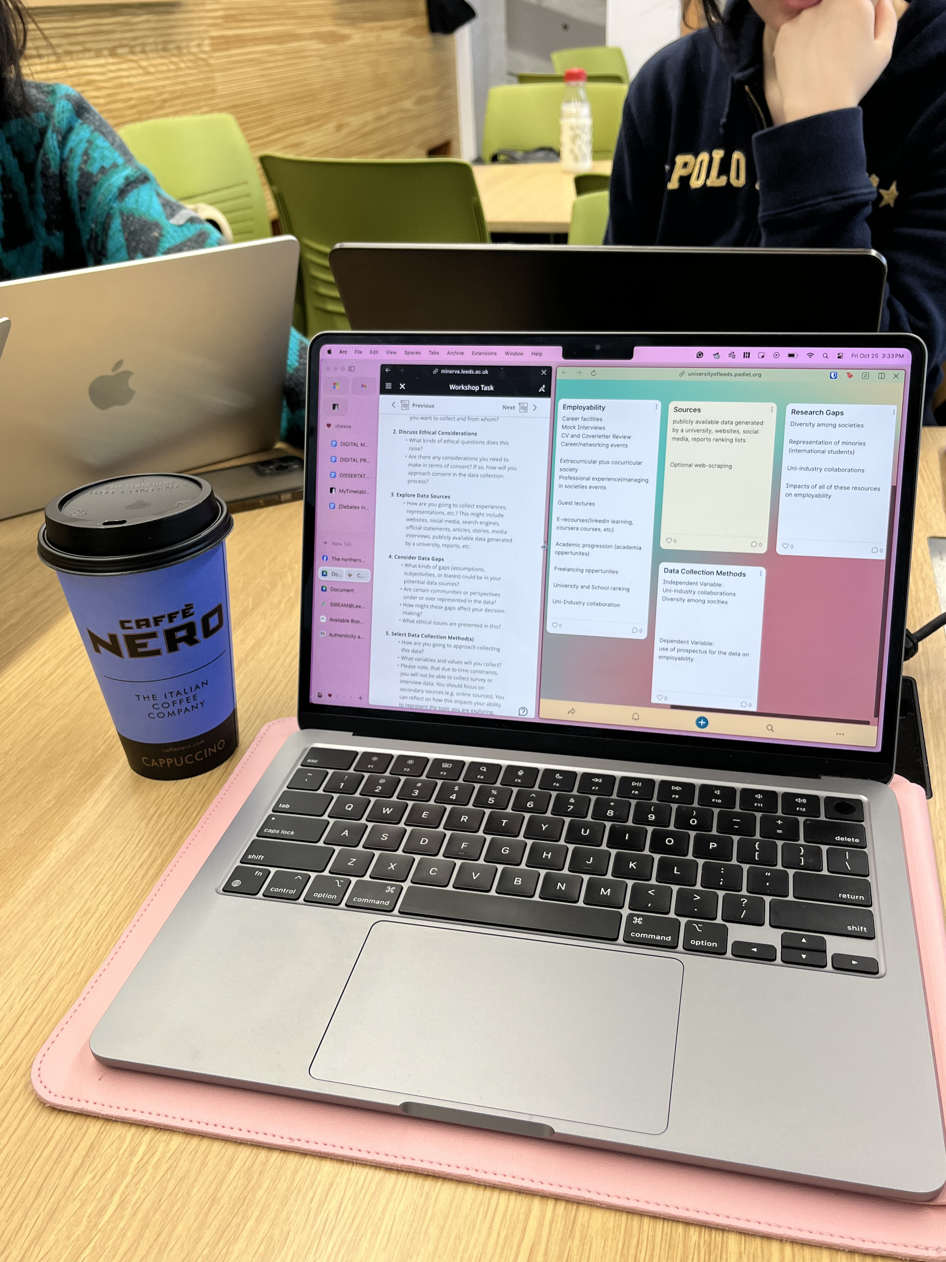 Our task was to collect and analyze data that would help the group understand the student experience. In our case, we came up with several ideas, and Holly offered her guidance on what might be best to focus on, as well as the limitations and research gaps that could arise.
