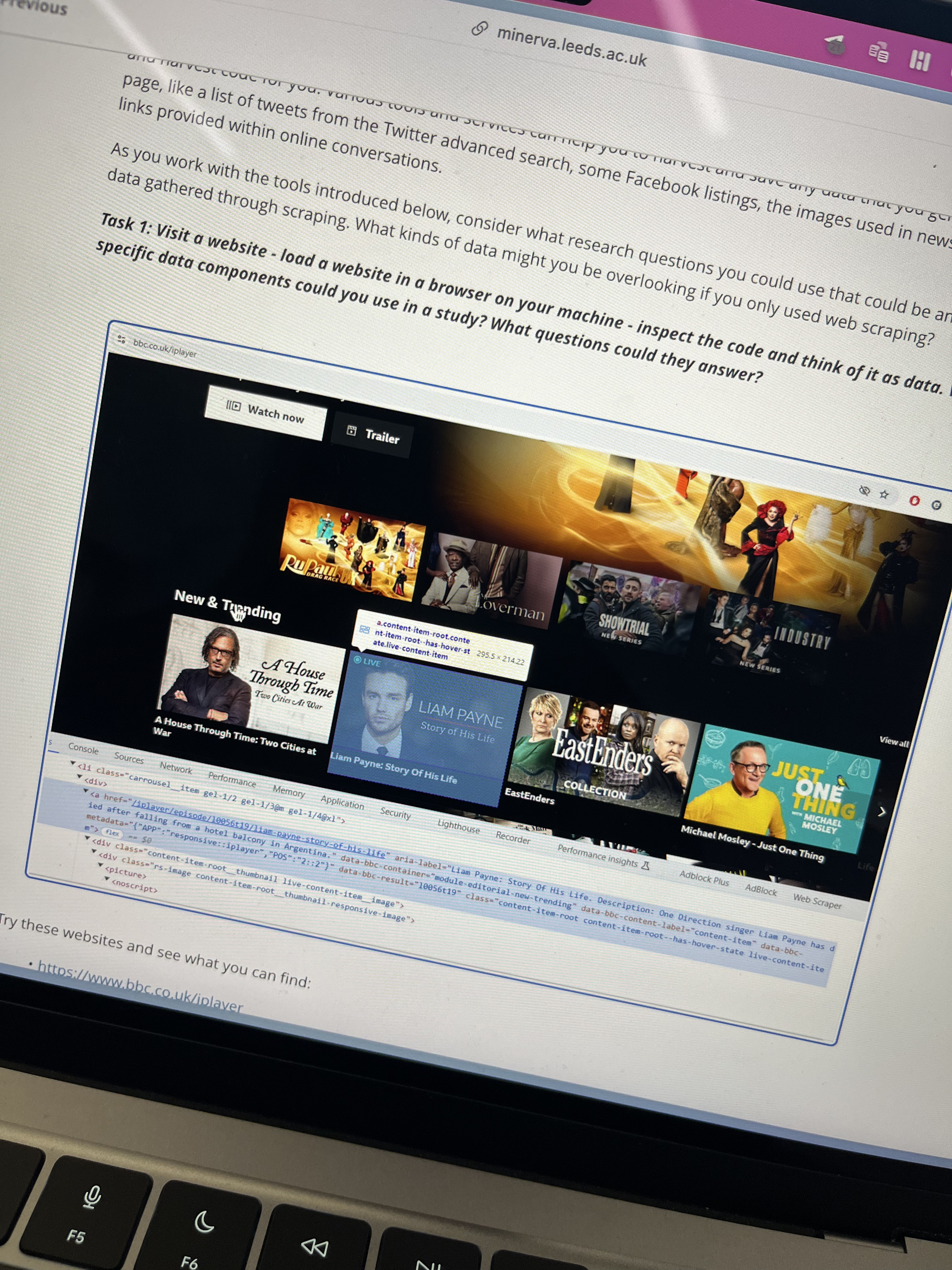 Week 3 involved a new topic still related to coding and other digital practices. In my case, this workshop seemed a bit more challenging, as it involved collecting data from other websites. Dr. Chris Birchall taught us the basics of how to scrape data from the web and collect it, which may be useful for our own research projects.