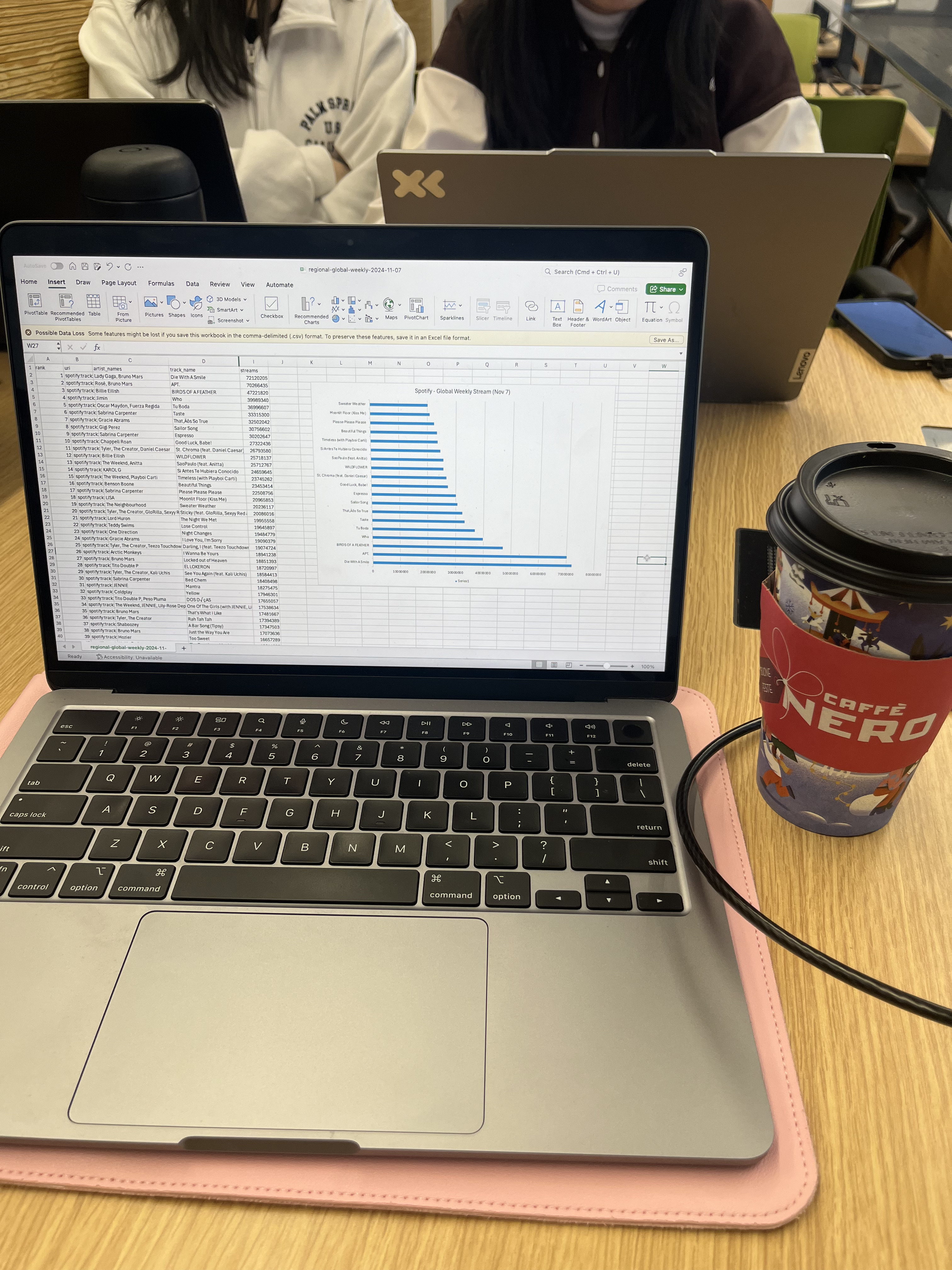 Other than that, we also had time to test our own data sets or even try out some of the data published in Minerva! I saw that they had Spotify on there and since I love listening to music, I decied to try that one out. We were tasked to use the data sets and visualize them by placing them into charts on excel. By doing this, I was able to see what songs and artists were currently popular for the week and it gave me a clearer picture of global music trends and how we might consume music based on what’s up and coming or gaining attention on streaming platforms such as Spotify.
