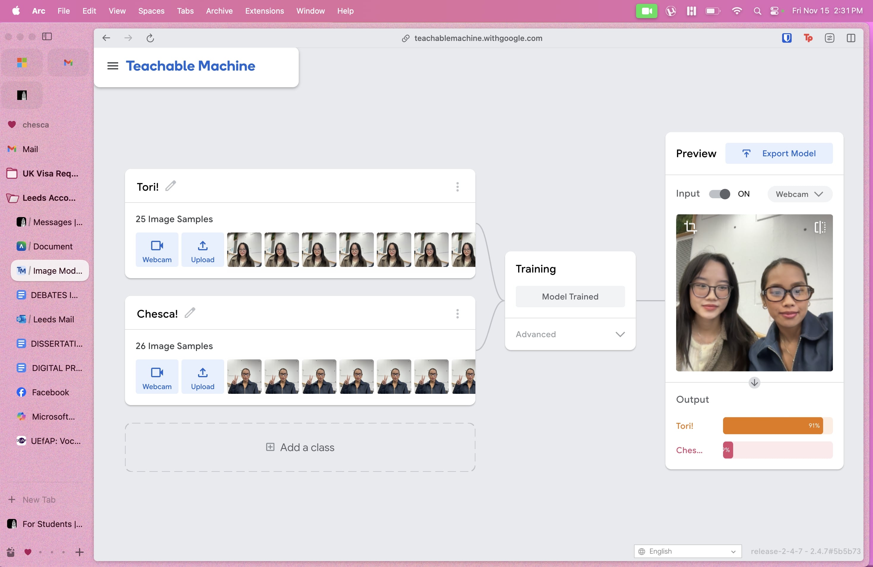 As for the workshop itself, we explored Teachable Machine and I was able to work with one of my classmates Tori wherein we tried to train a model to distinguish which one was which. We even ended up tricking it to get confused and even when I was present in the image, majority of the detection done by the machine was pointing to Tori! By the end of this session, I realized how facial recognition technology offers many benefits but also raises concerns about privacy, bias, and fairness, especially for marginalized communities. It’s important to balance the benefits with ethical considerations to prevent misuse and ensure fairness for everyone.